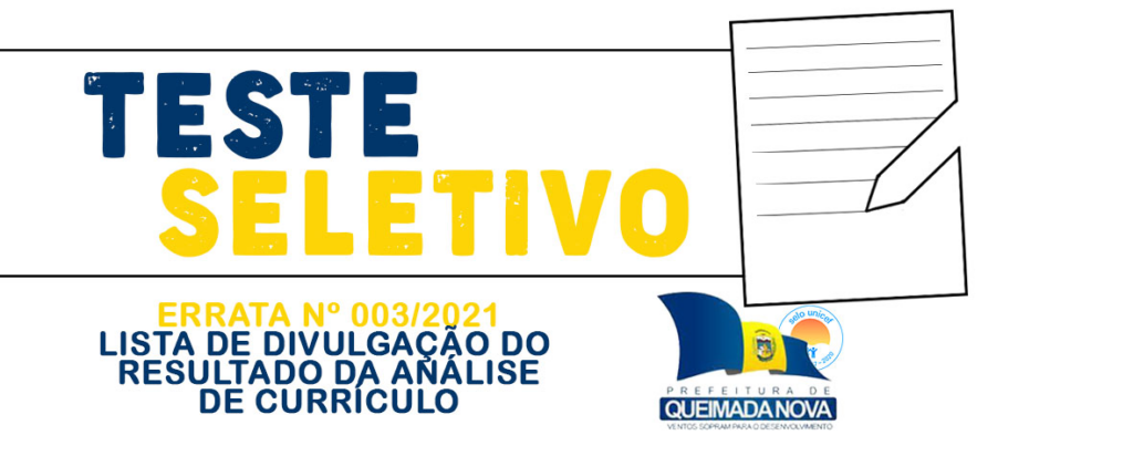 A Comissão do Teste Seletivo, Edital nº 001/2021, publica a ERRATA Nº003/2021 À LISTA DE DIVULGAÇÃO DO RESULTADO DA ANÁLISE DE CURRÍCULO.