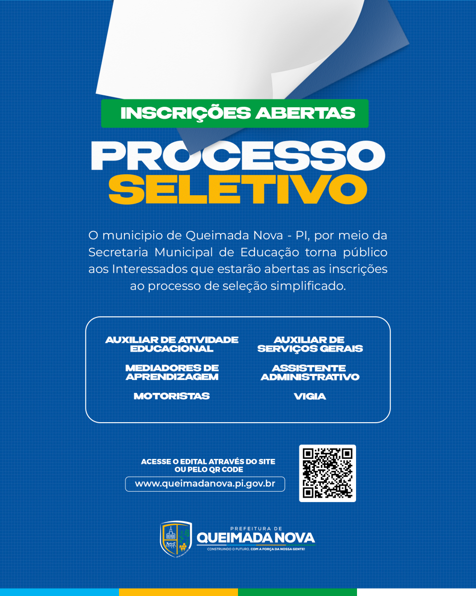 O município de Queimada Nova – PI, por meio da Secretaria Municipal de Educação torna público aos Interessados que estarão abertas as inscrições ao processo de seleção simplificado.