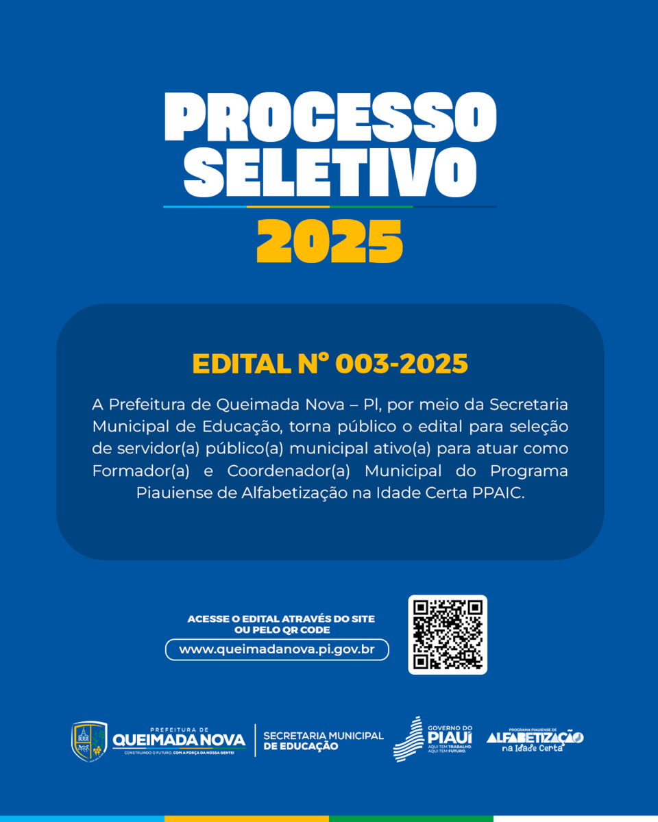 A Prefeitura de Queimada Nova – Pl, por meio da Secretaria Municipal de Educação, torna público o edital para seleção de servidor(a) público(a) municipal ativo(a) para atuar como Formador(a) e Coordenador(a) Municipal do Programa Piauiense de Alfabetização na Idade Certa PPAIC.